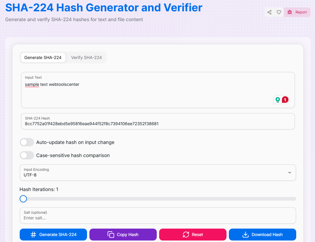 The SHA-224 Hash Generator & Verifier is an essential asset for anyone serious about cryptographic security and data validation. By combining industry-standard algorithms with advanced features like salting and real-time verification, you can manage your digital security with absolute confidence. Start securing your data today!