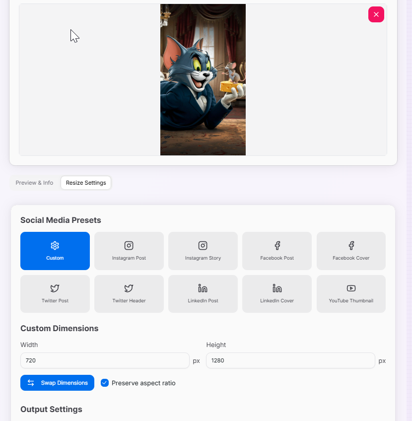 - 3Configure resize settings:Social Media Presets:Choose from platform-specific presets for Instagram, Facebook, Twitter, LinkedIn, and YouTube.Custom Dimensions:Use the width and height inputs to set your desired dimensions manually.Aspect Ratio:Toggle "Preserve aspect ratio" to maintain image proportions.